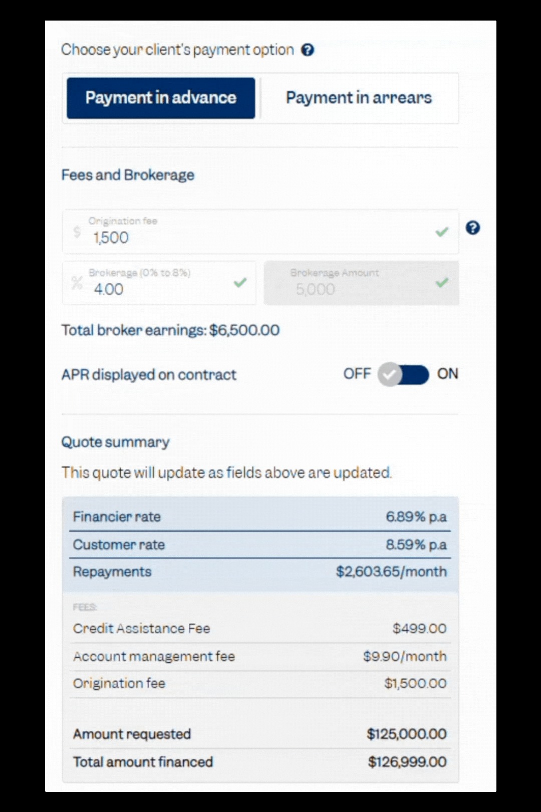 | Model different scenarios: Instantly toggle between ‘Advance’ and ‘Arrears’ to find the optimal solution for your client. |