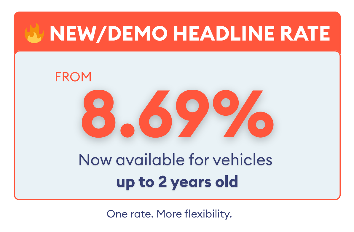 Our New/Demo headline rate now stretches to cover vehicles up to 2 years old. Think of it as moving the stumps, but in your favour. |